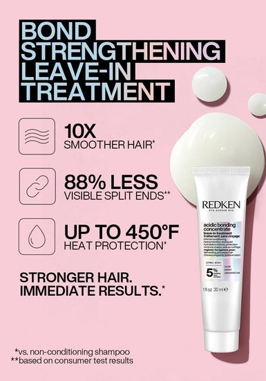 Formulated with Citric Acid, this bonding treatment contains a concentrated bonding care complex that reinforces weakened bonds within your hair to improve hair strength. This Redken Leave-in Conditioner repairs strength in damaged hair, provides heat protection up to 450 degrees, tames frizz, adds shine and reduces hair breakage.