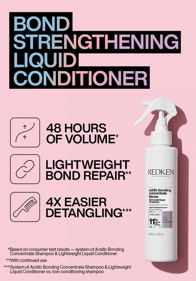 • Redken Acidic Bonding Concentrate Lightweight Liquid Conditioner is a lightweight sprayable bonding conditioner for clients with fine, damaged hair.