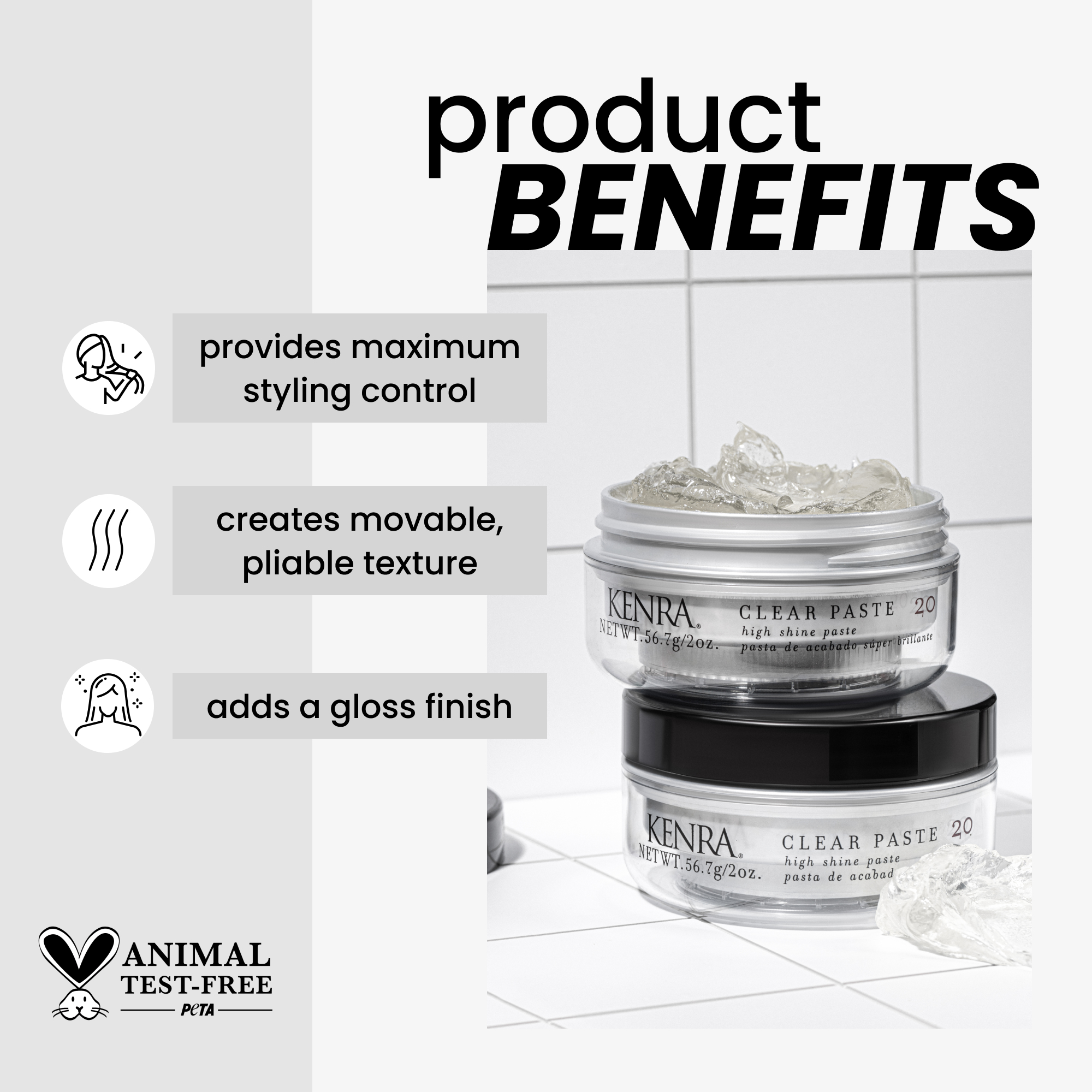 Kenra Clear Paste 20 is a high-shine styling paste designed to provide maximum control while creating movable, pliable texture.