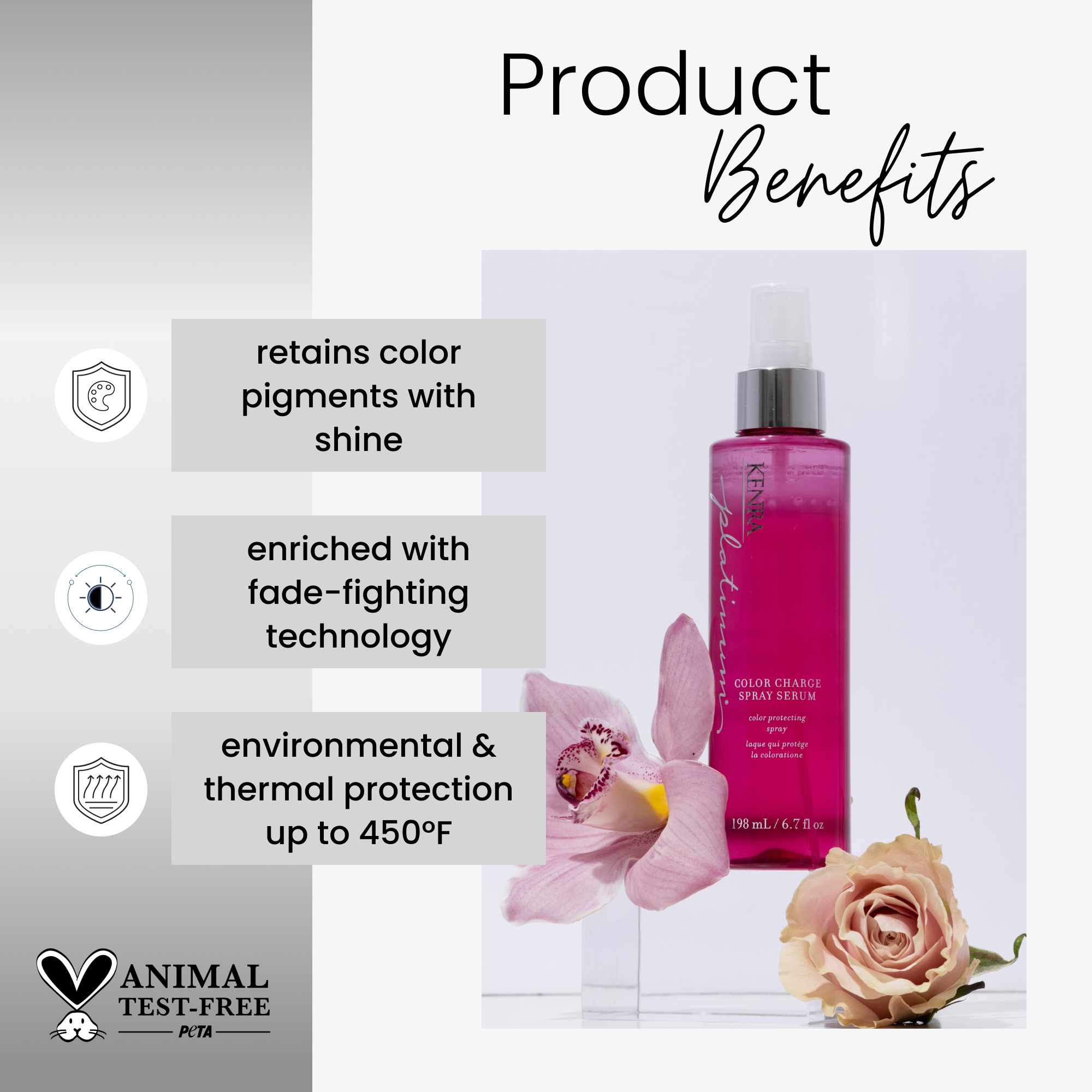 Kenra Platinum Color Charge Spray Serum is a color-protecting spray designed to deliver ultimate protection against environmental stressors and heat styling up to 450°F (232°C). Formulated with Fade-Fighting Technology, it helps retain color pigments inside the hair cuticle, ensuring long-lasting shine and maximum color vibrancy.