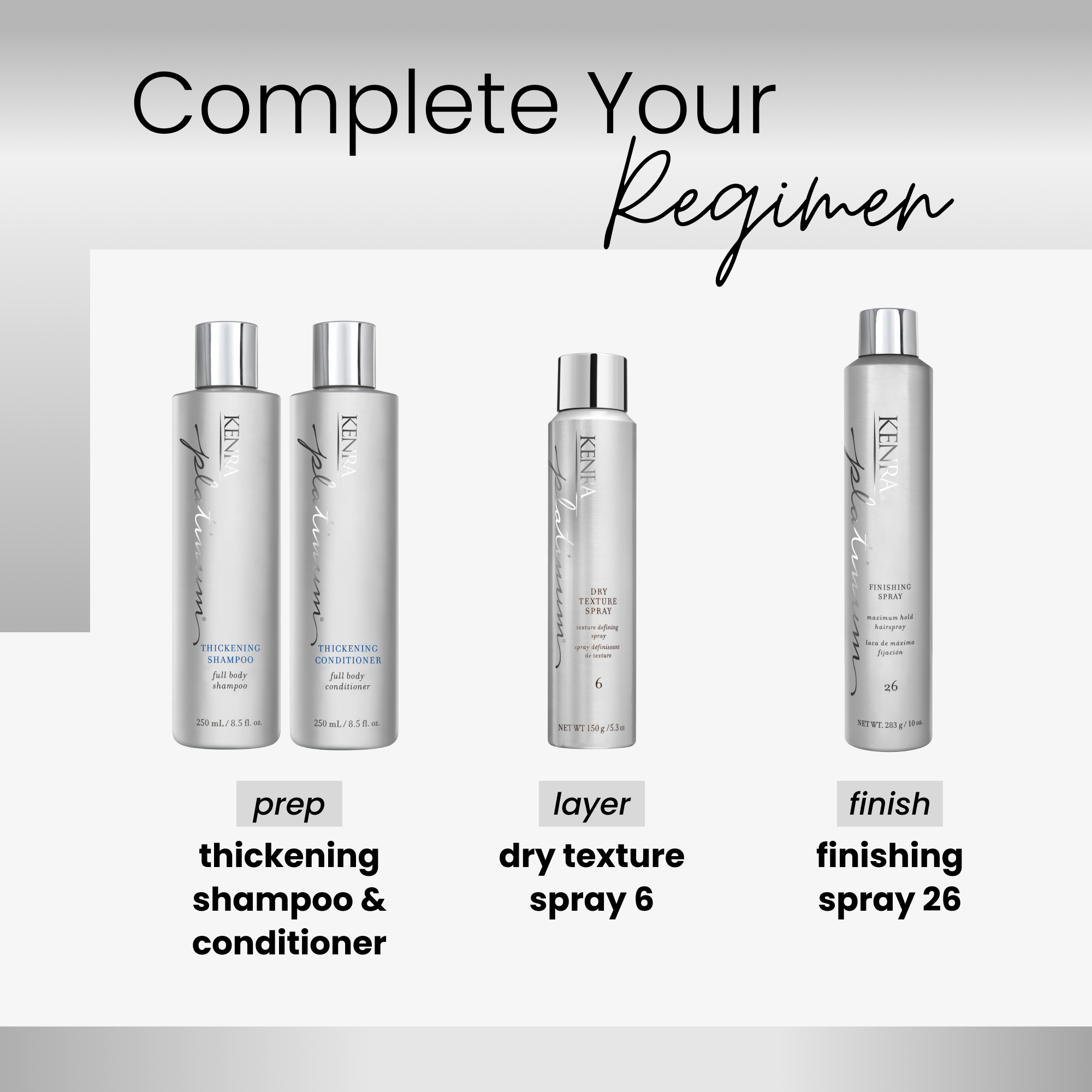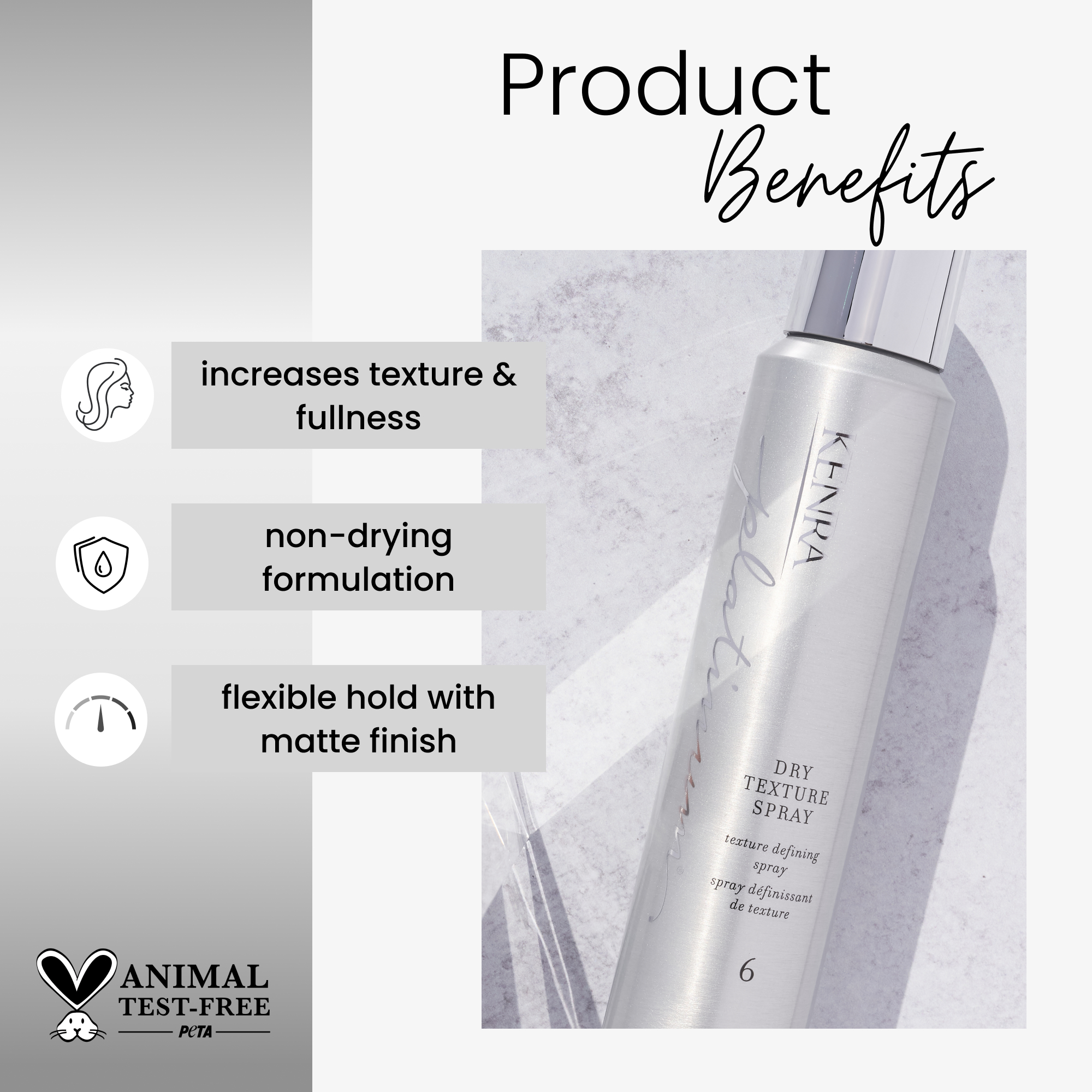 Kenra Platinum Dry Texture Spray 6 is an ultra-lightweight texture defining spray designed to instantly improve texture, fullness, and grip while absorbing excess oils and impurities. Its non-drying formula delivers a flexible hold with a natural matte finish, making it ideal for effortless, lived-in styles.