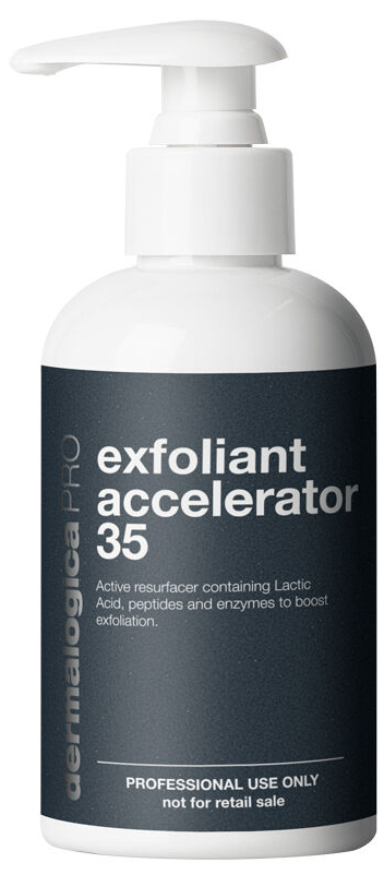 This low pH (3.2) concentrate in a Chamomile Extract base contains skin smoothing ingredients including Lactic Acid, peptides and enzymes from bacteria and Papaya, plus fermentation enzymes to boost exfoliation. Exfoliant Accelerator 35 is a highly active concentrate that may be used undiluted on skin or added to Dermalogica chemical exfoliants to intensify and accelerate exfoliation activity.
