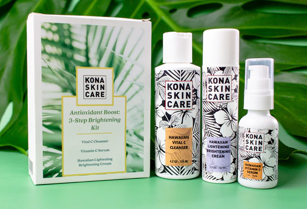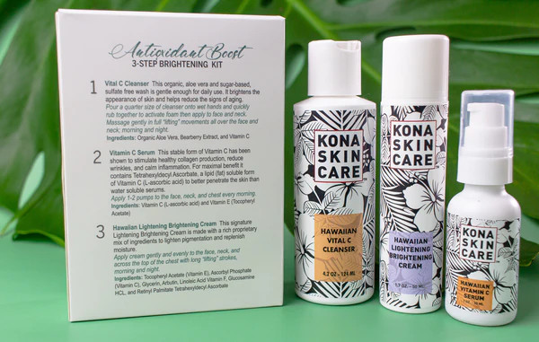 This Antioxidant Boost Brightening Kit includes a 4 oz. Vital C Cleanser, 1 oz. Vitamin C Serum, and 1.7 oz. Lightening Brightening Cream.