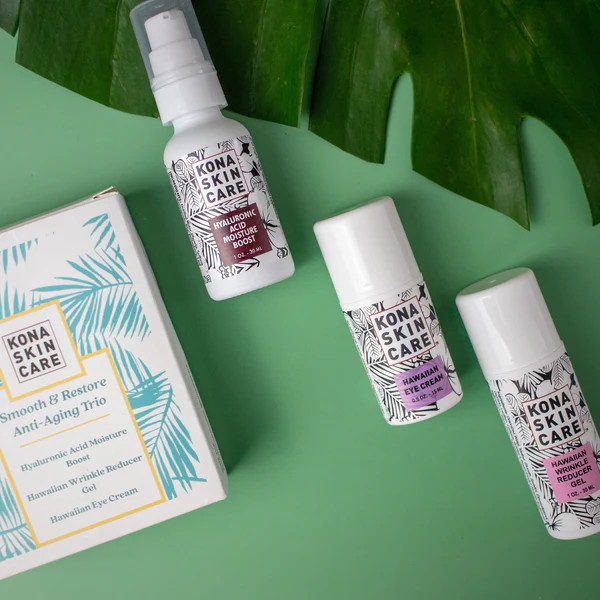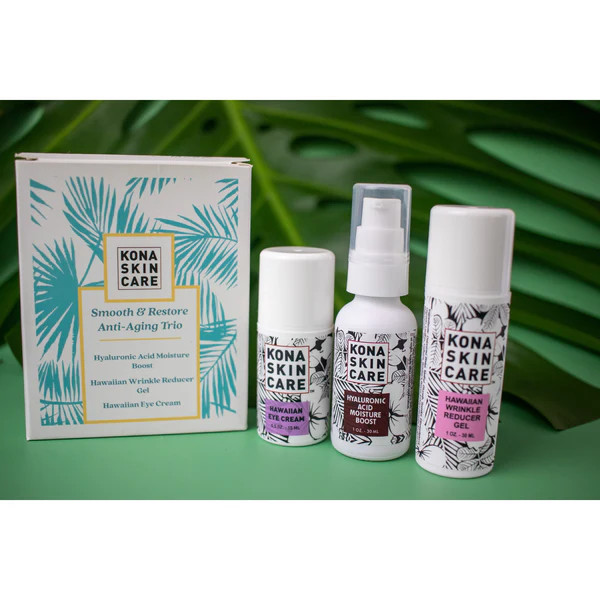 This kit includes 1 oz. Hyaluronic Acid Moisture Boost Serum, 1 oz. Wrinkle Reducer Gel, and .5 oz. Eye Cream.