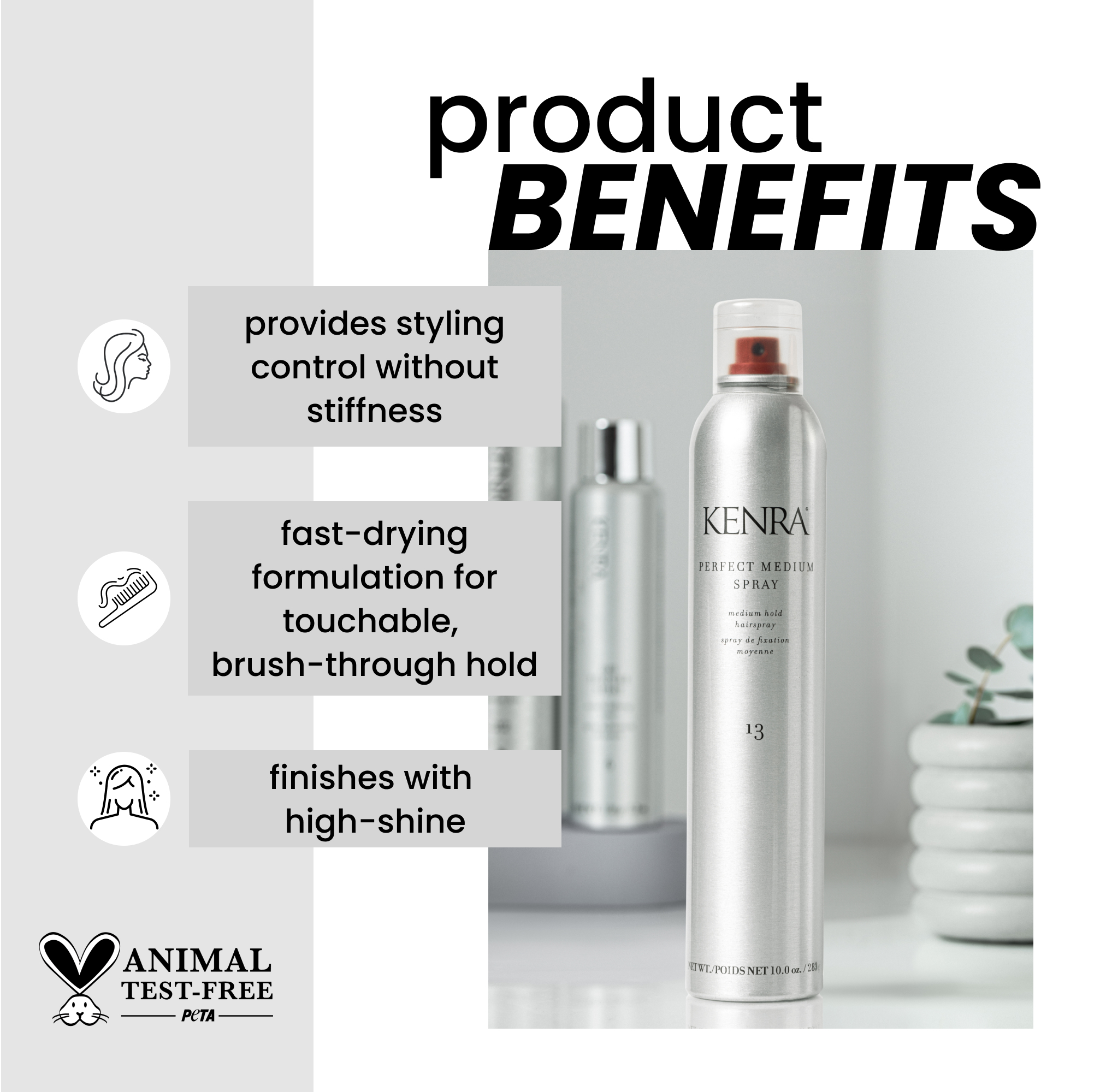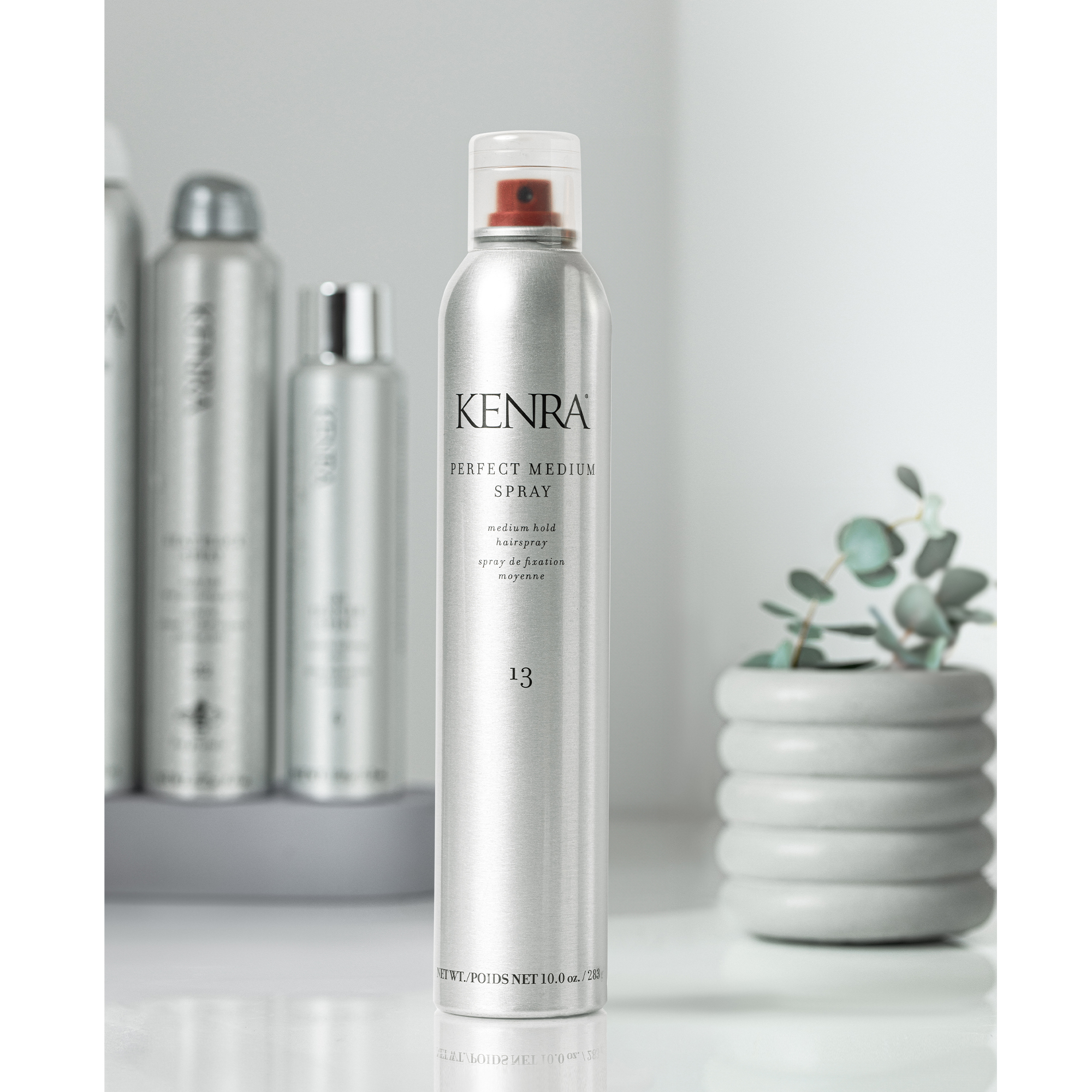 Kenra Perfect Medium Spray 13 is a medium hold hairspray designed to provide styling control, brushable hold, and high shine without stiffness.