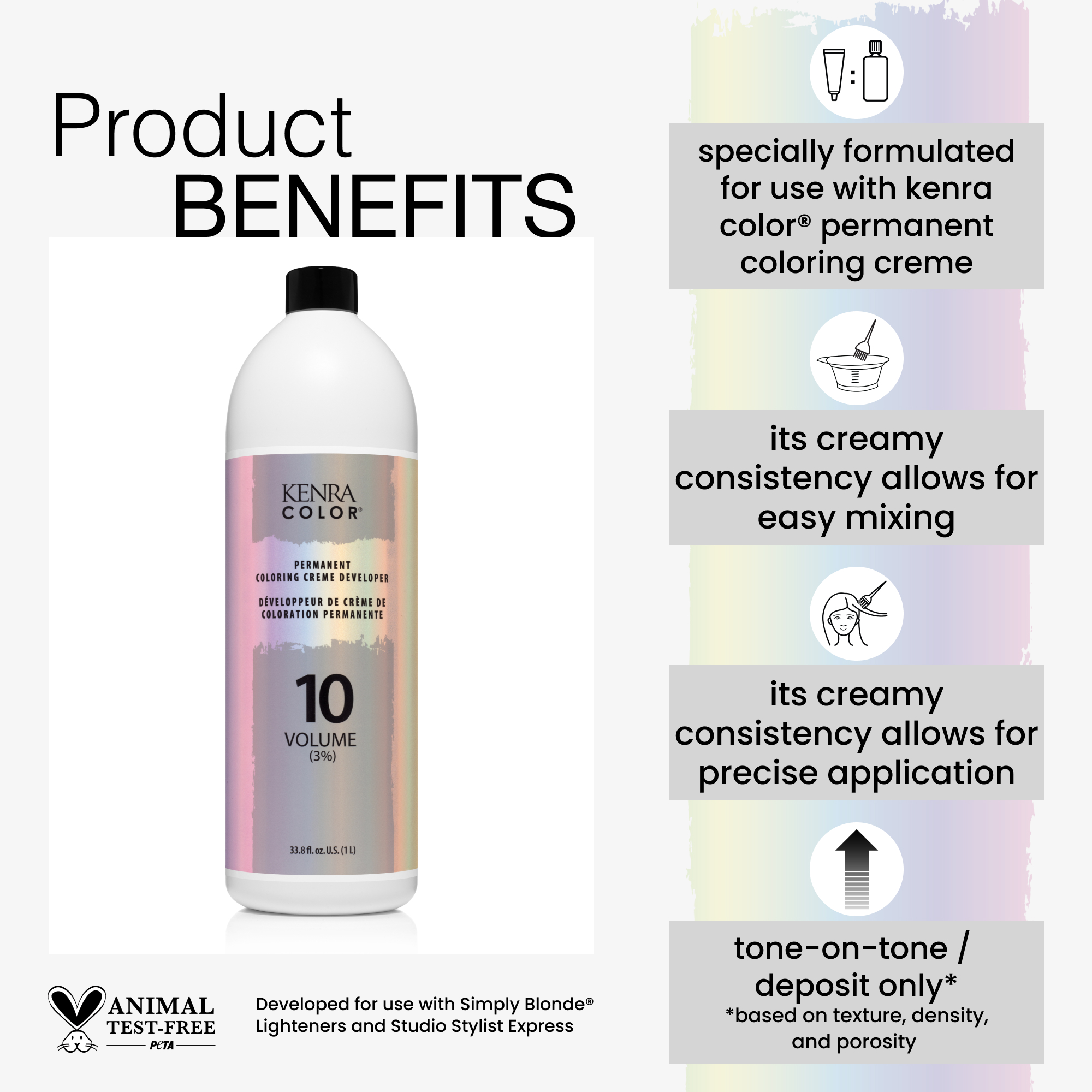 Kenra Color Permanent Developer 10 Volume (3%) is specially formulated for use with Kenra Color Permanent Coloring Creme to deliver consistent, reliable results.