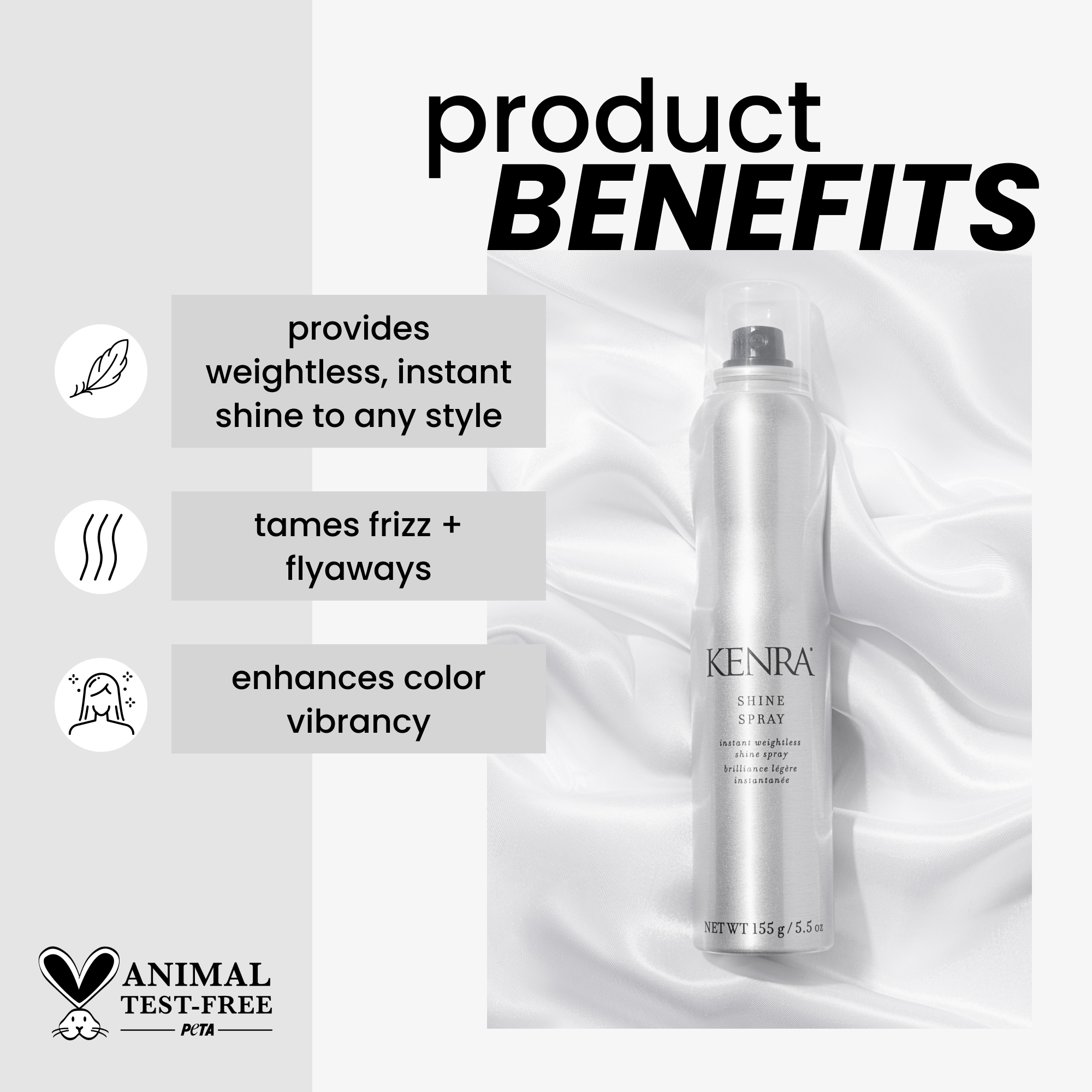 Kenra Shine Spray is an instant, weightless finishing spray that delivers brilliant shine while taming frizz and flyaways. Ideal for all hair types, it enhances color vibrancy and leaves hair looking polished and radiant without weighing it down.