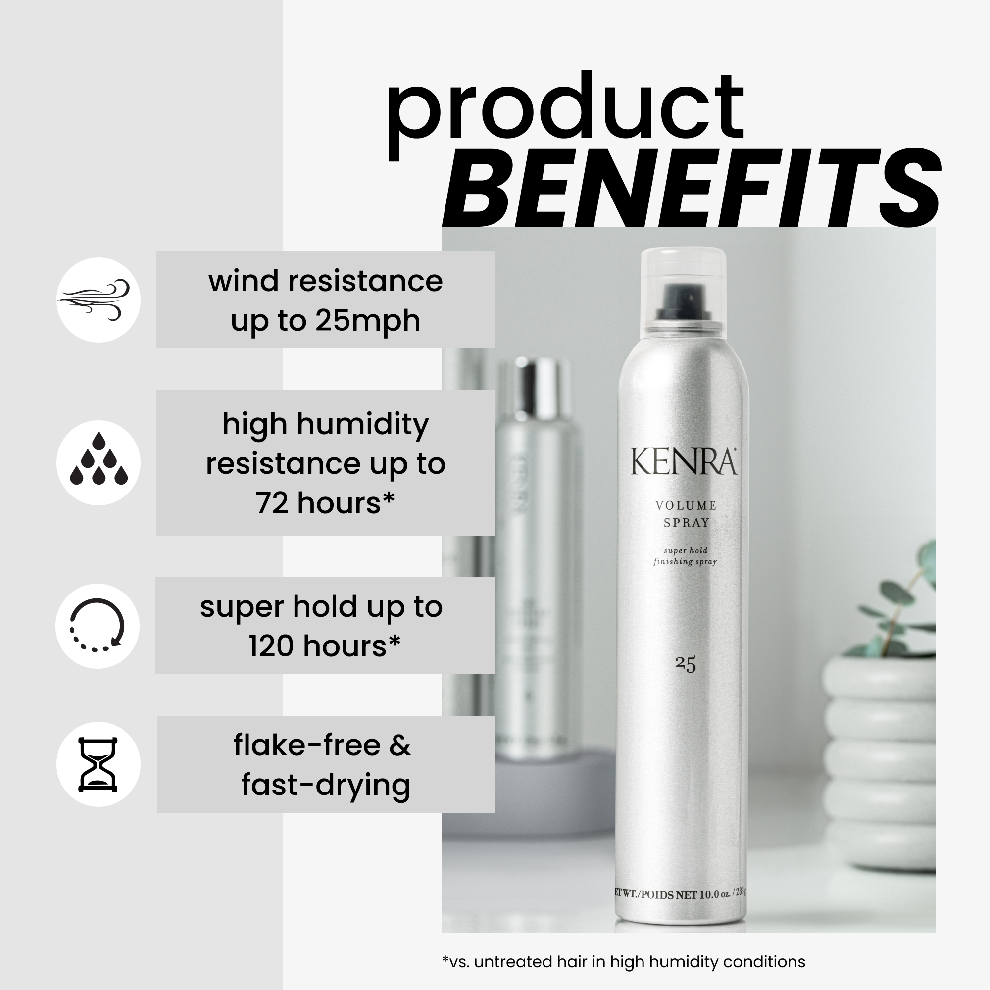 Kenra Volume Spray 25 is a super hold finishing spray designed to deliver maximum control, long-lasting volume, and durability in extreme conditions. Its fast-drying, flake-free formula provides strong hold while maintaining shine and flexibility. Ideal for finishing styles that need extra security, this spray offers wind resistance and high humidity protection for long-lasting results.